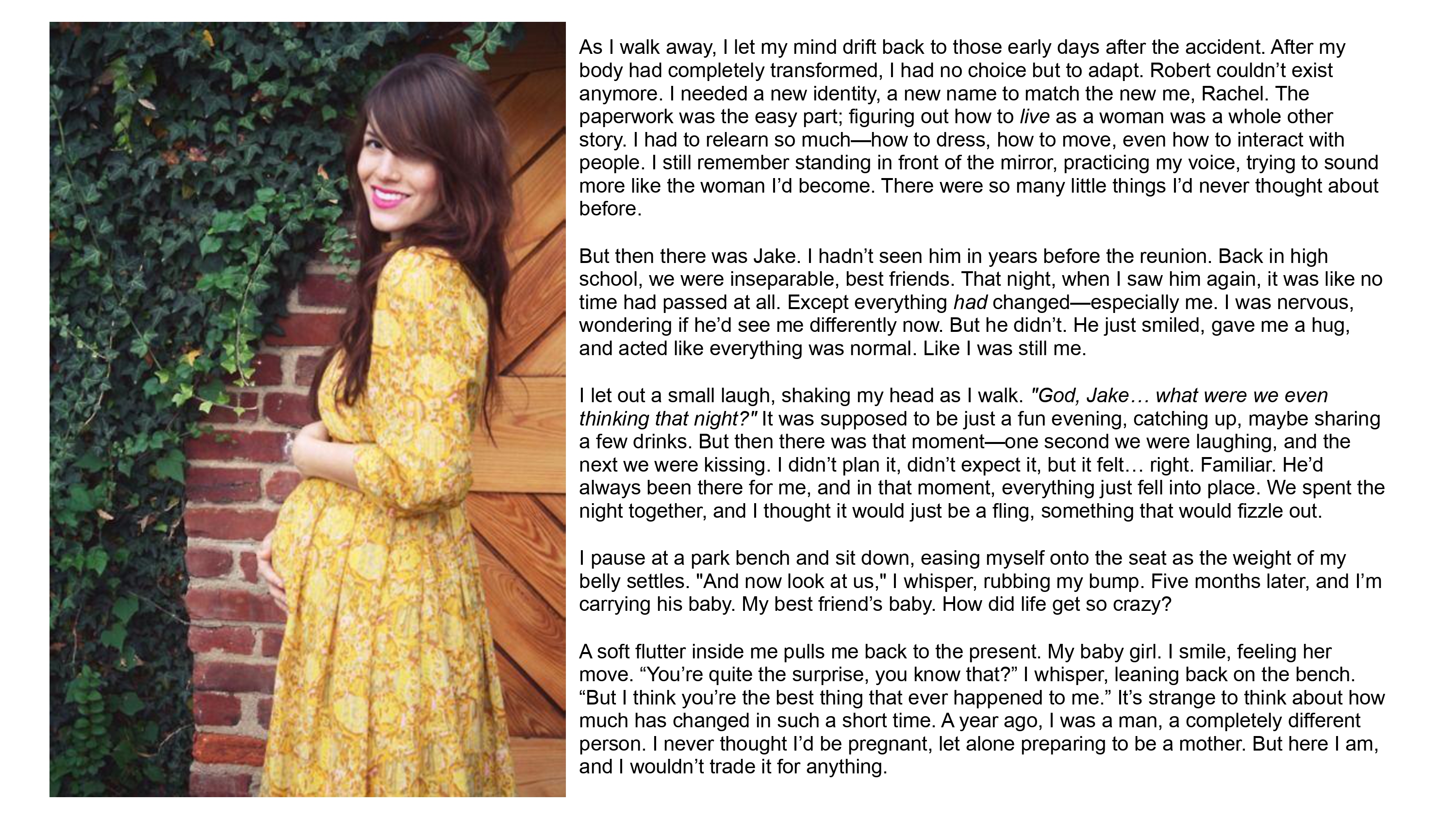 As she sat in her bedroom, her hands resting on her round belly, Michaela smiled at the thought of their future. In just a few short weeks, she would give birth to their daughter — Lily, the name they had both agreed on. It felt right, just like so much of her life now. She was ready for this next step, ready to become a mother and to continue her life as Michaela, not as Michael. The baby moved again, a strong kick that made Michaela laugh softly. She was going to miss this feeling — the sensation of life growing inside her — but she couldn’t wait to meet her baby girl face-to-face.